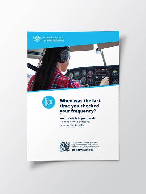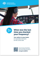 This poster reminds pilots to regularly check and confirm their radio frequency during flight.